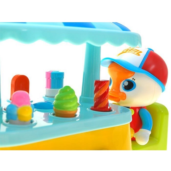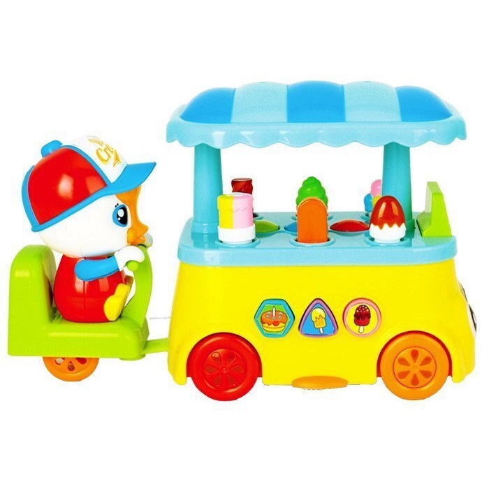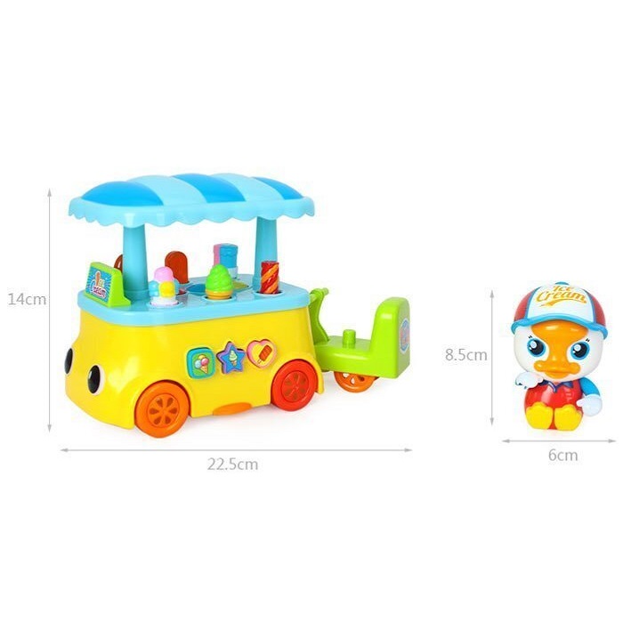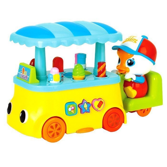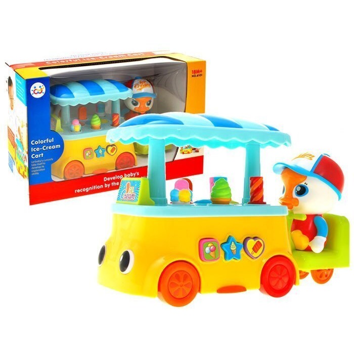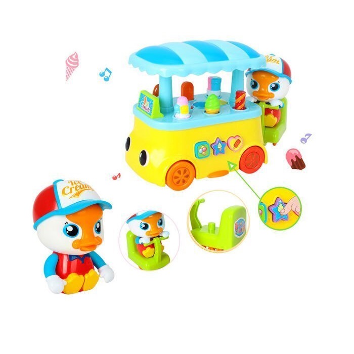 اسباب بازی اردک بستنی فروش برند هولی تویز Huile Toys؛ طراحی کودکانه و خلاقانه ای دارد و به افکت های نوری و قابلیت پخش صدا و موزیک مجهز است. این ماشین بستنی فروش موزیکال، مناسب رده سنی 18 ماهگی به بالا می باشد.این اسباب بازی جذاب نیاز به 3 عدد باطری قلمی AA دارد و قابلیت حرکت به اطراف همراه با روشن و خاموش شدن چشم های ماشین و دیگر چراغ های آن را دارد همچنین با روشن کردن محصول، بستنی های روی دکه بستنی فروشی بالا و پایین می روند و حرکت دارند.